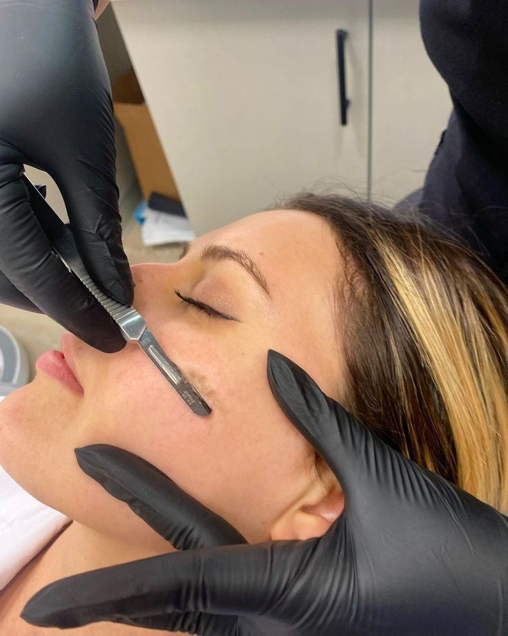 Dermaplaning is a facial treatment that involves using a sterile surgical blade to gently exfoliate the top layer of facial skin, removing dead skin cells and fine vellus hair (peach fuzz).